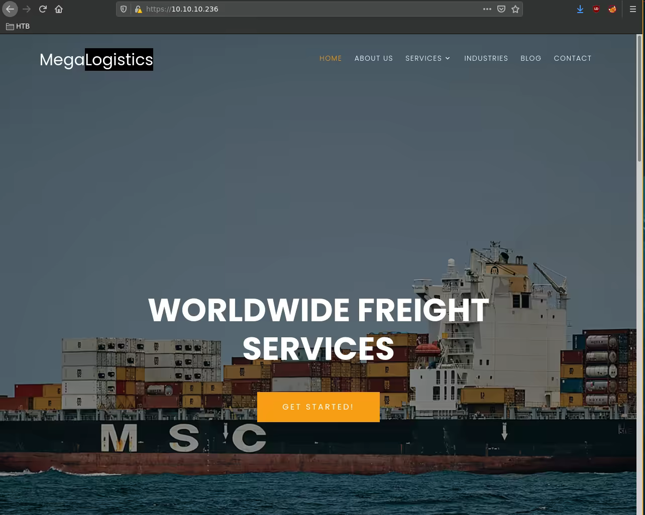Our nmap scan also picked up the admin.megalogistic.com domain name from the self-signed SSL certificate, so let's add it to our hosts file: