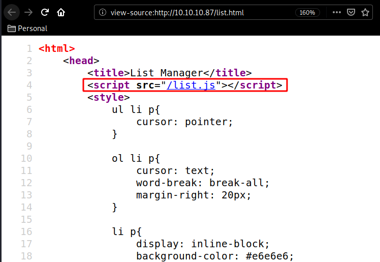 Here we are greeted with a simple http website, and peeking at the sourcecode we are hinted towards a /list.js script: