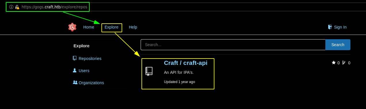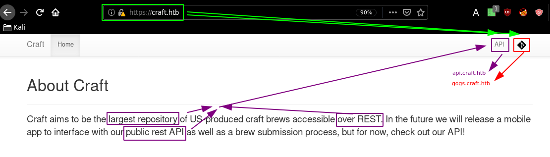 Said public rest API is a subdomain of craft.htb which is api.craft.htb so we need to add it to our hosts file as well as the gogs subdomain: