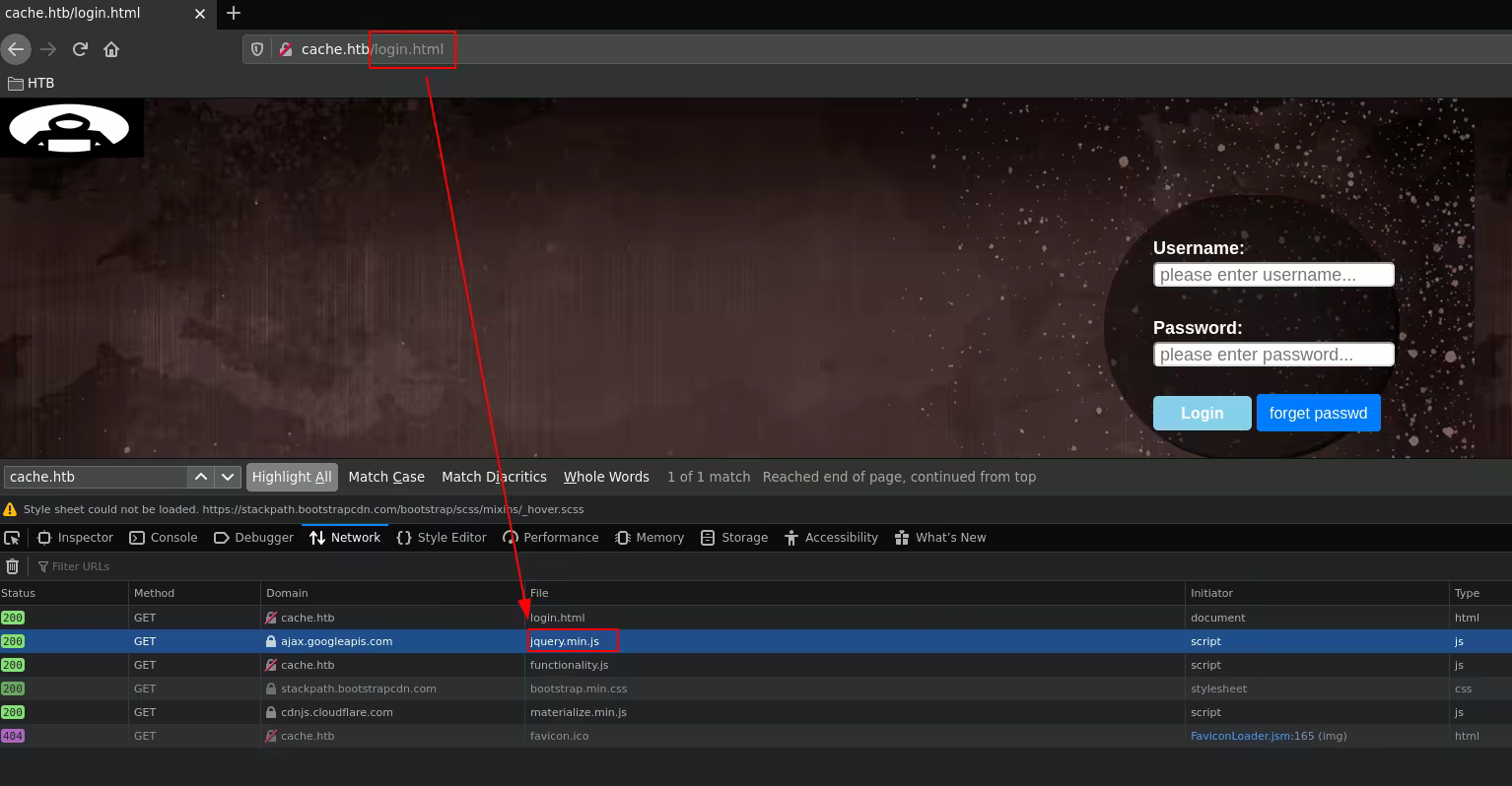 Now when we browse to login.html we get a hint that the server is using jquery: