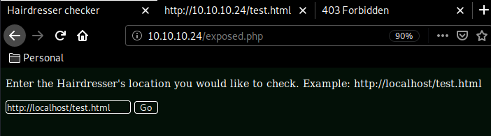 Looks like we're out of luck for that image for now. looking back at our dirsearch results, we find the test.html page which again just has a single image on it and nothing else. but we also have an exposed.php webpage. and looking at it's error messages, we see that it's using curl to find the webpage we request.