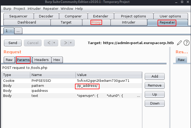 looking at the pattern parameter, we see that it is a regular expression %2F ( / ) , ip address, and then %2F ( / ) so let's investigate this further by sending the request over to the repeater (ctrl + r) and then going there (ctrl + r) then into the params tab where we can clearly see the pattern we described earlier :