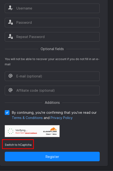 Choose "switch to hCaptcha" otherwise, you might get stuck at the Cloudflare verification.