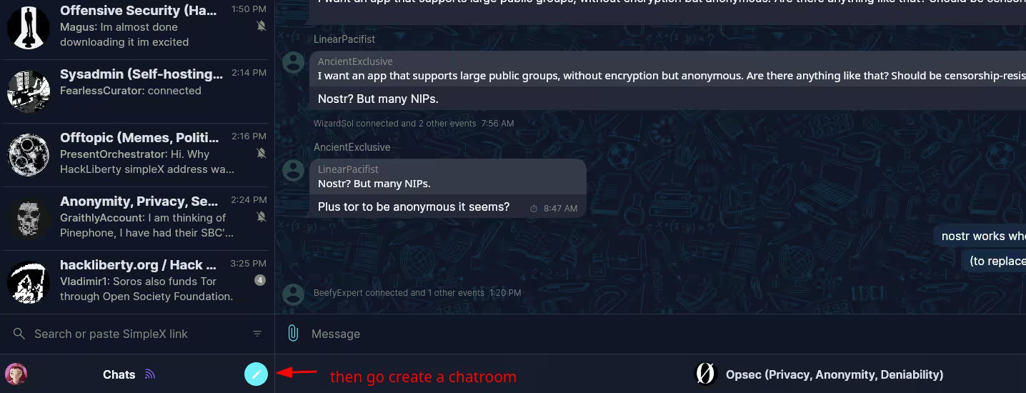 Now that we are using our own simplex servers, we can create a chatrooms in incognito mode (meaning that our username will simply be a random noun and adjective):