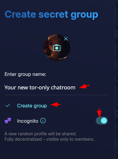 Tick the Incognito option. Doing this ensures your profile name and image is hidden from your group members and allows for anonymous connections with other people without shared data. Once you have filled out the necessary information, press Create group.