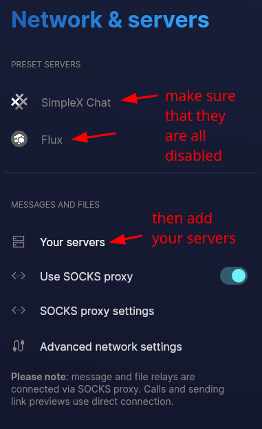 Now from our simplex client we need to make sure that we are using our own simplex servers, which have the following URL that we got from our logs earlier (Quick note, one or both of your server addresses may be trailed with an addition port like ,443, you can delete this part when you input them into your client)"