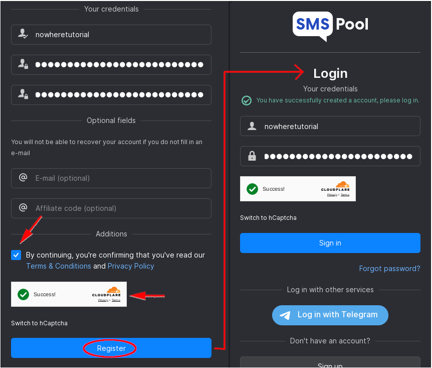Register a unique username and password. Accept the Terms & Conditions, verify you are human and click Register. Then simply log in.