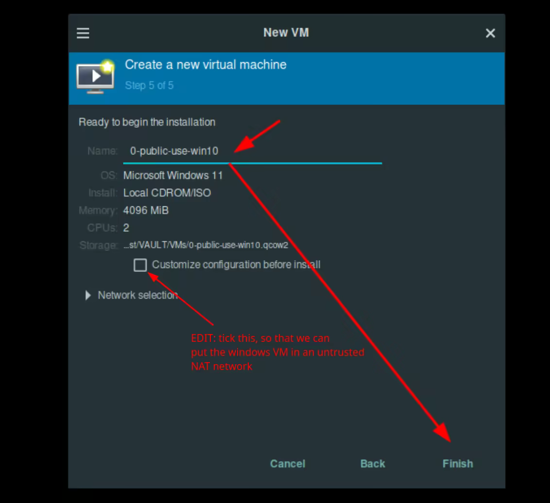 Then before we begin the installation, we make sure that the windows VM uses the untrusted NAT network to make sure it remains isolated: