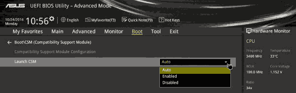 Boot > CSM settings > Launch CSM Auto