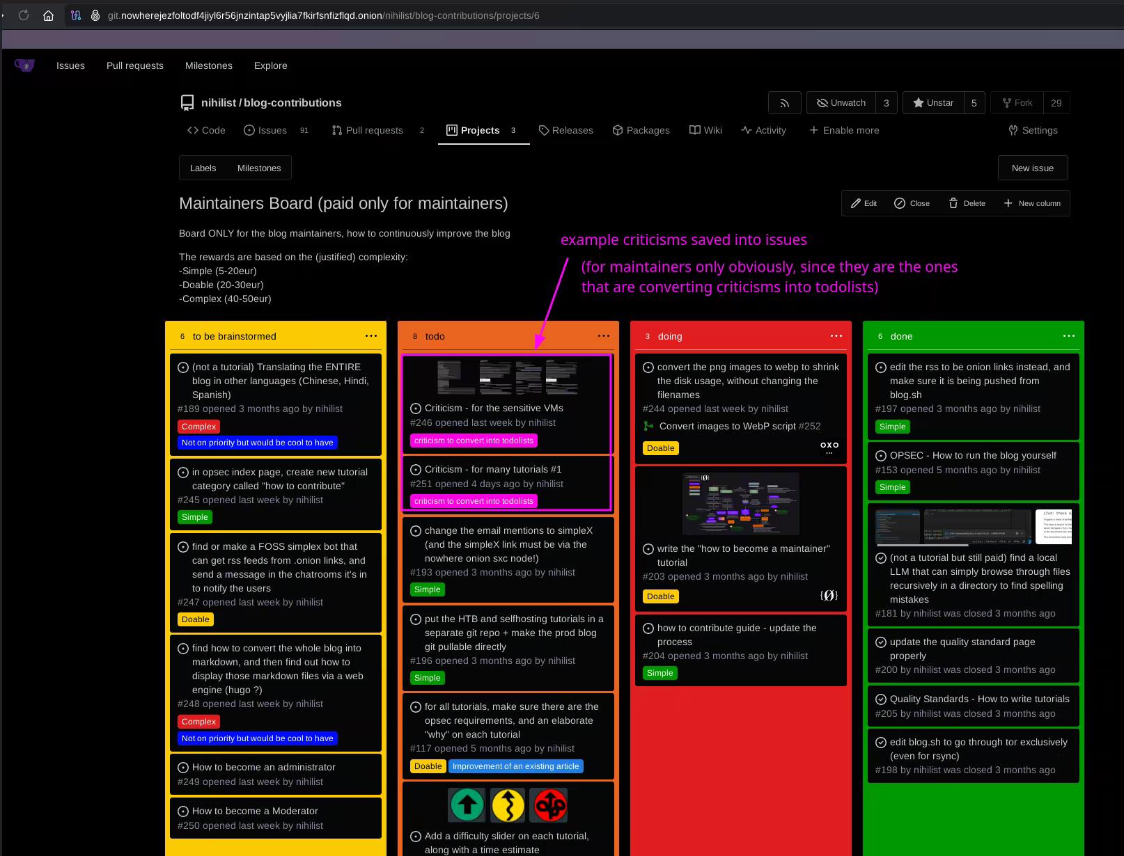 If you want to save the criticism somewhere on the git repo for later, go into the maintainers project board and create a git issue there, with the title starting with "Criticism - For the tutorials XYZ", and make sure you add the label "criticism to convert into todolists" , that'll help us make sure that criticisms aren't lost forever, but rather are stored somewhere, to be treated at a later time: