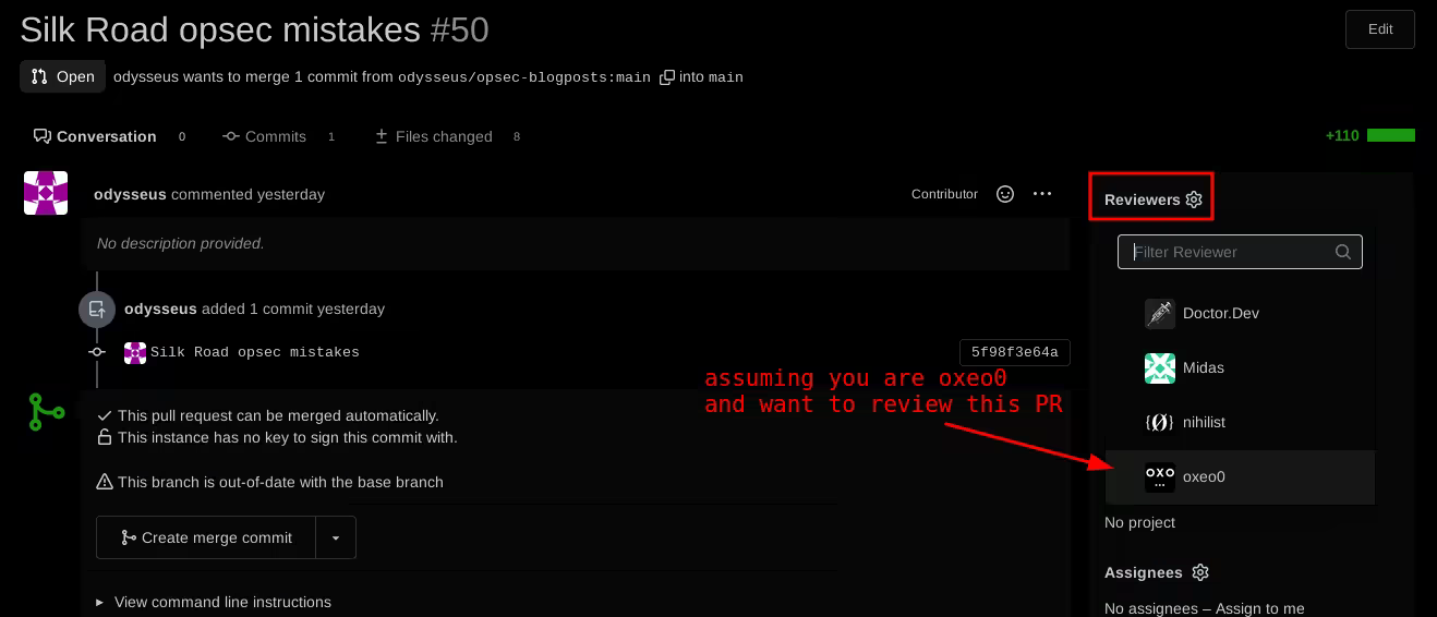 This means that if there is a contributor submitting work for an agorism-related issue, we'll assign it automatically to crabmeat, however in the case of multiple maintainers specializing on the same fields (such as system administration, which nihilist, oxeo and midas can review), we follow the usual first come, first served approach - when a new PR is opened, you can reserve it by assigning yourself as a reviewer: