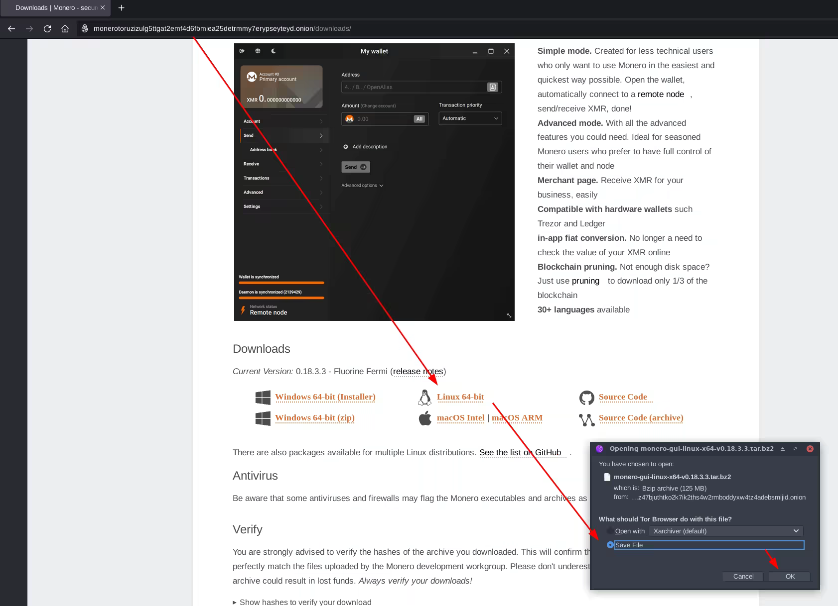 First let's download the monero GUI wallet from https://getmonero.org: (.onion address: http://monerotoruzizulg5ttgat2emf4d6fbmiea25detrmmy7erypseyteyd.onion)