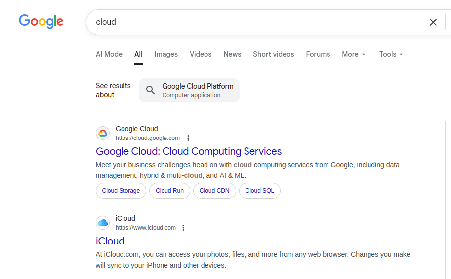On another day, you might be looking to set up a cloud storage account to back up personal files. You type "cloud" into Google, and once again, the first results that appear are services offered by major corporations known for close collaboration with government agencies. In other words, the leading options presented to you effectively encourage you to store your personal data with providers that may share information with state authorities.