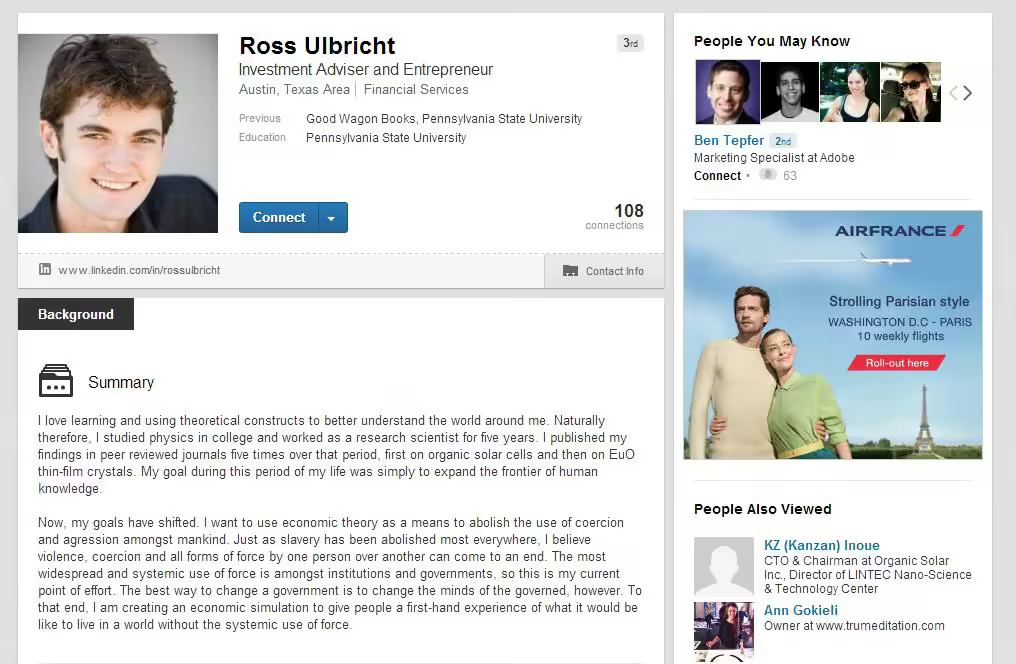 After discovering Ross's email and conducting further research, law enforcement found his LinkedIn and his YouTube accounts, where he openly shared his liberal opinions that align closely with the views and ideologies of Dread Pirate Roberts, the owner of Silk Road, and the site's community. In his LinkedIn bio, he states: