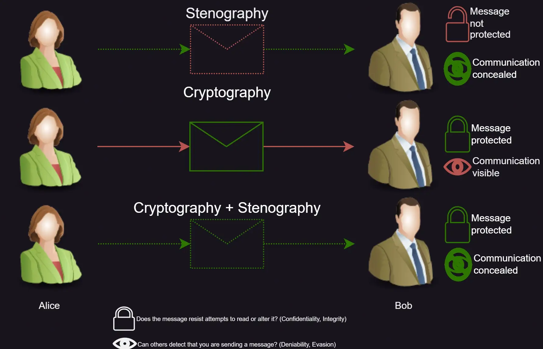 Here a quick overview of using steganography alone, cryptography alone and combining the two: