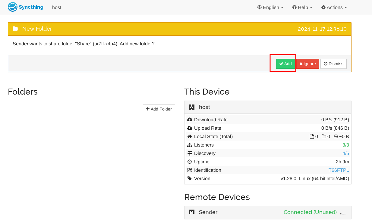Agree and add the folder, after that syncthing will automatically transmit the files