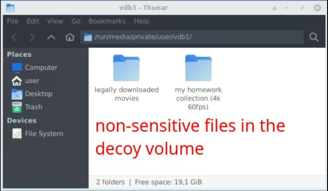 DISCLAIMER: we're using only harddrives (HDDs) here, because using SSDs are not a secure way to have Plausible Deniability, that is due to hidden Volumes being detectable on devices that utilize wear-leveling