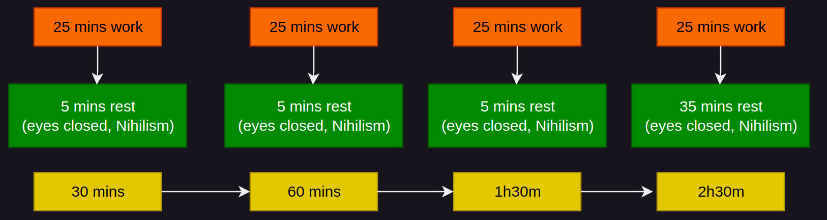 The question also is what the hell do you do during your breaks? do you just open up your phone and start scrolling through social media? My recommended break method is to do a quick Nihilism meditation, to reset your mind: