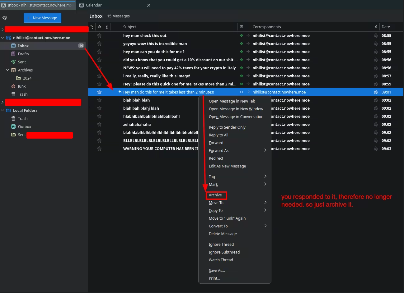 And once a mail is no longer needed / if it got actionned / if you actionned it / if you responded to it, you need to archive it , so that it doesnt occupy any space in your mailbox anymore, and it doesn't potentially distract you from the mails that matter the most.