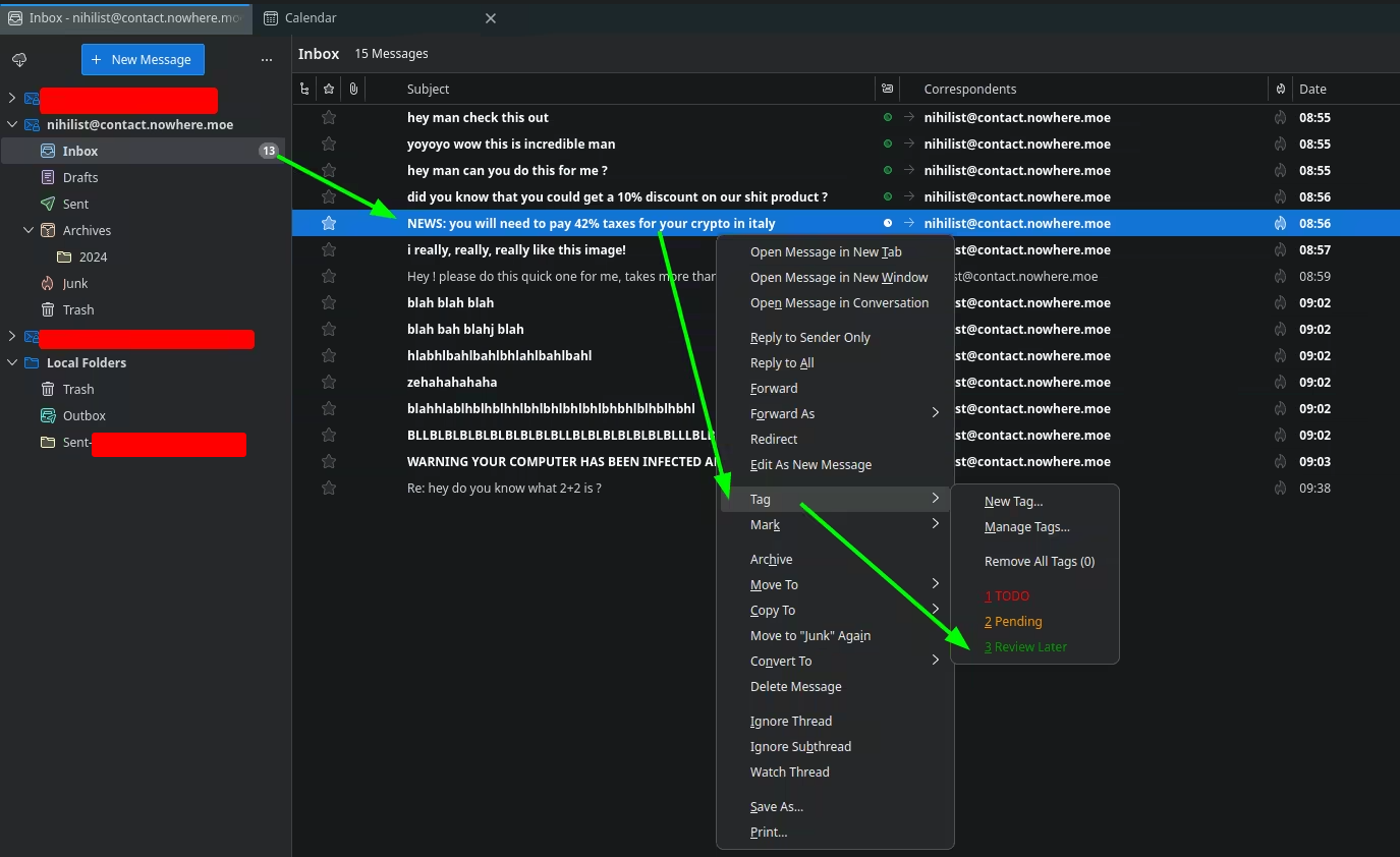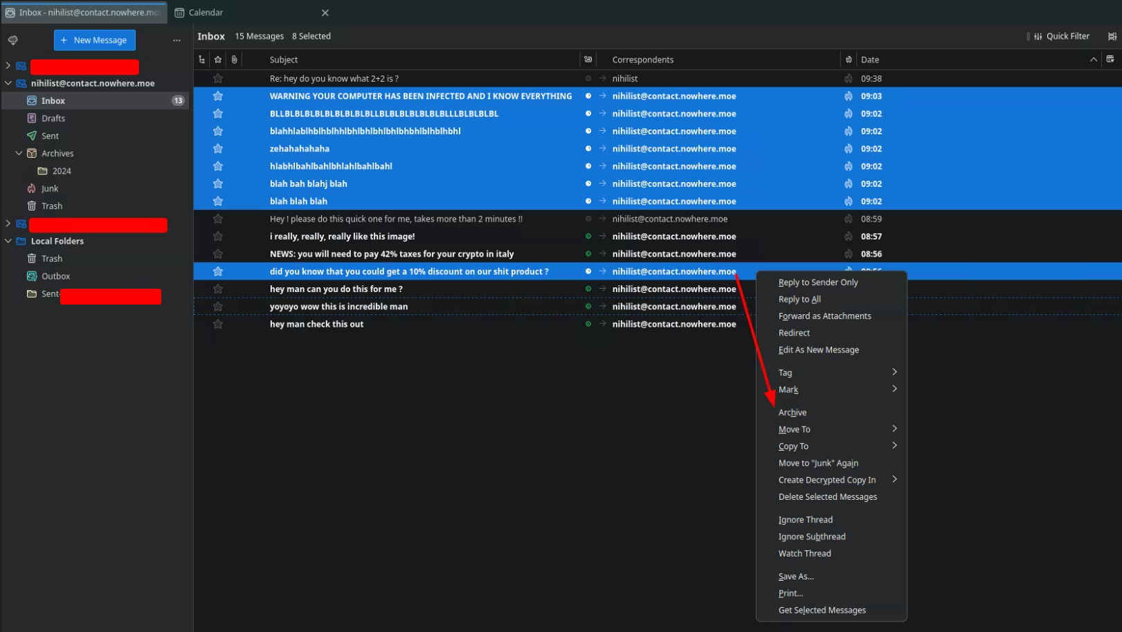 And then as you probably guessed we recieved alot of spam, so to select them in one go we can either do "CTRL + LEFT CLICK" or "SHIFT + LEFT CLICK" to select more than one at a time, to archive them.